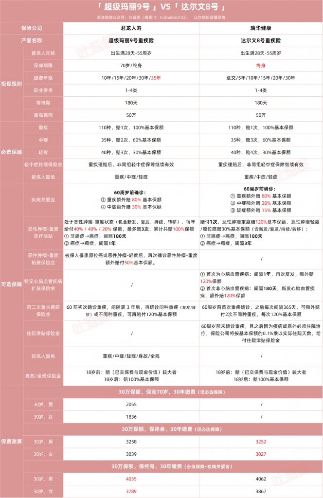 达尔文8号间隔期稍微短一些,60岁前患重疾,1年后即生效,而超级玛丽9号要3年。