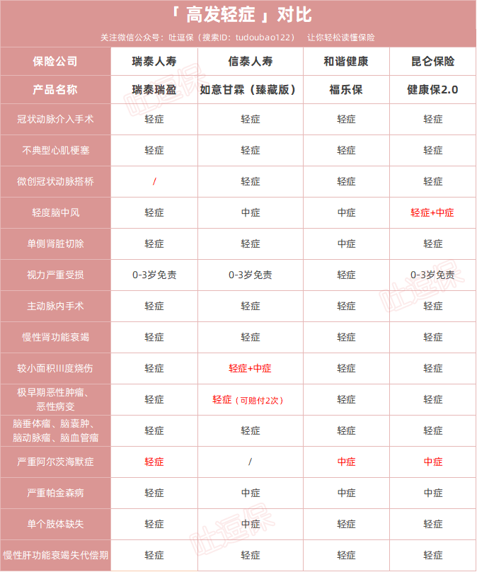 针对11种高发轻/中症的覆盖全面,病种设置也都合理,其中福乐保和健康保2.0覆盖的最为全面