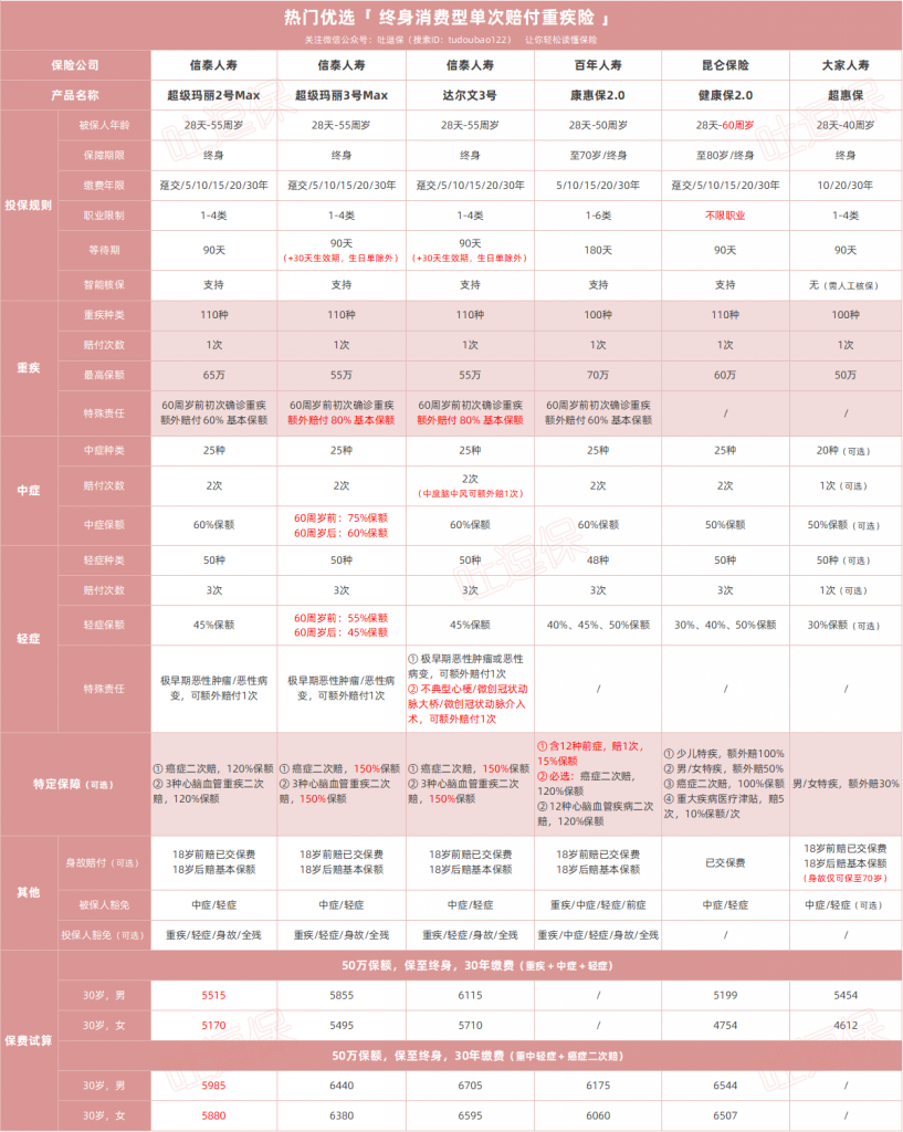 2、终身消费型单次赔重疾险Top6