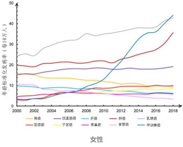 2000年至2018年,男性所有癌症的发病率总体保持稳定,但女性有所增加👇: