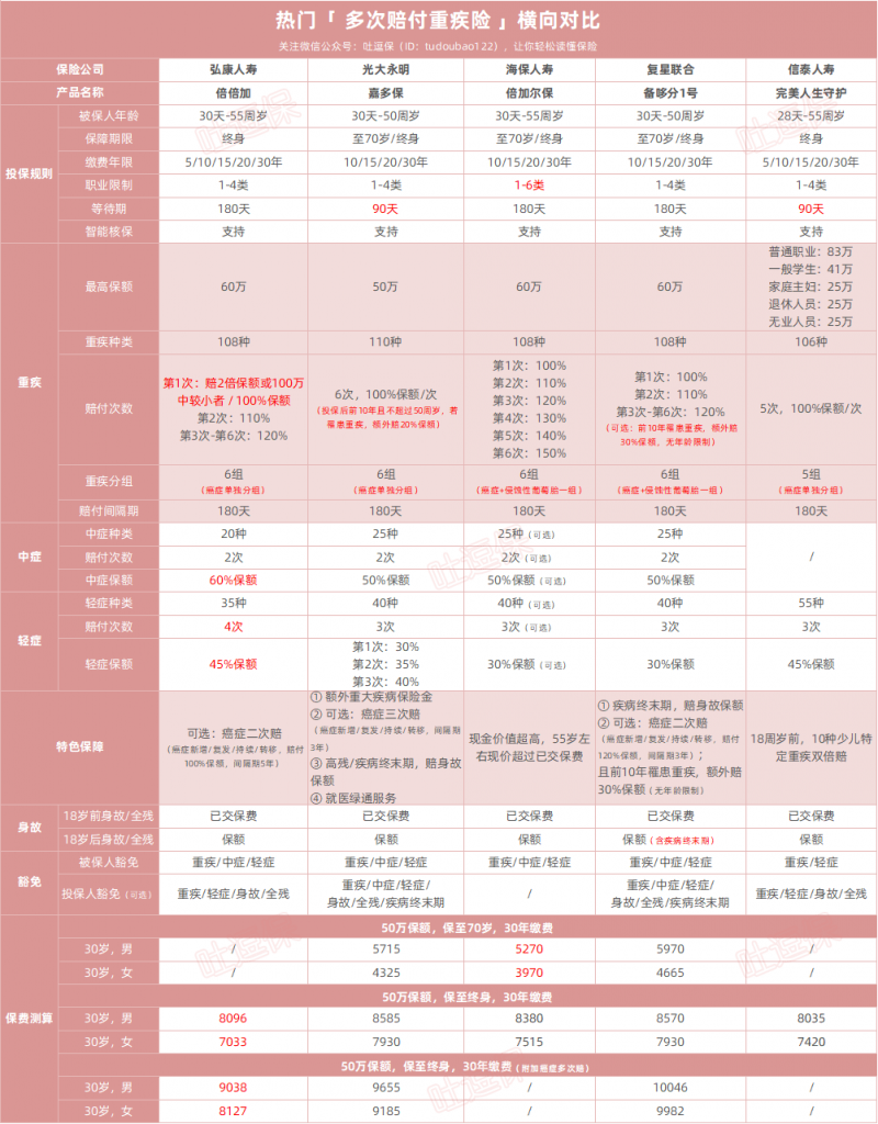接下来,逗逗酱将倍倍加与目前市场上几款优质的多次赔付重疾,进行详细的对比测评。