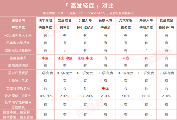 此外倍嘉乐保对高发轻症的覆盖也很全面,而且对脑中风定义为中症,赔付的保额更高: