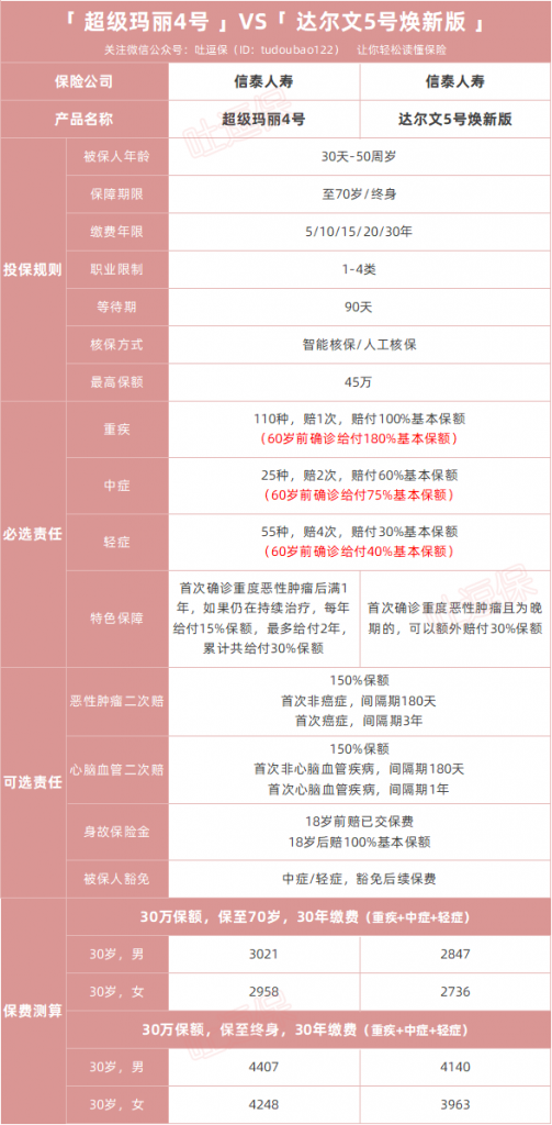 现如今大部分的新规产品都强制附加身故保障,这也使得这超级玛丽4号和达尔文5号焕新版,反而算是重疾险圈的一股清流了。