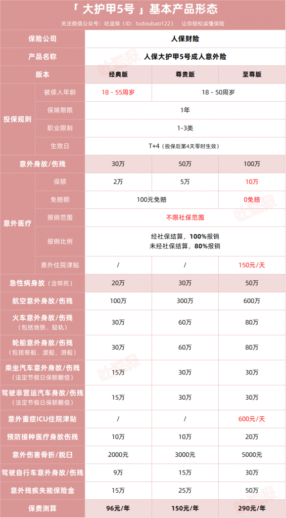 这几个月,人保也是吃到了互联网保险的甜头,直接推出了大护甲的升级版本——「 大护甲5号成人意外险 」。