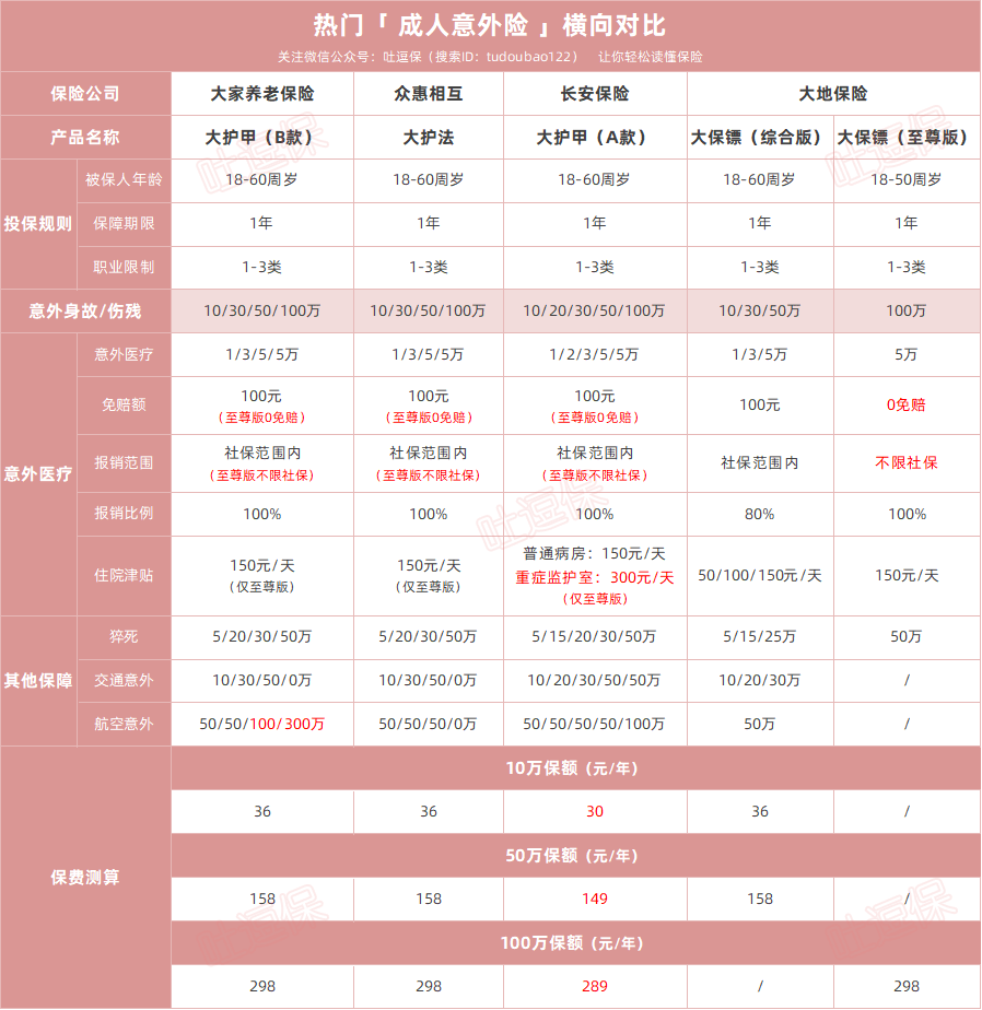 二、热门成人意外险对比测评