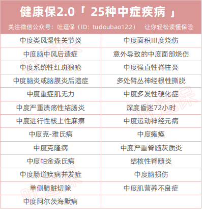 健康保2.0的中症保障25种中症,可不分组赔付2次,每次赔付50%基本保额,且含被保人中症豁免。