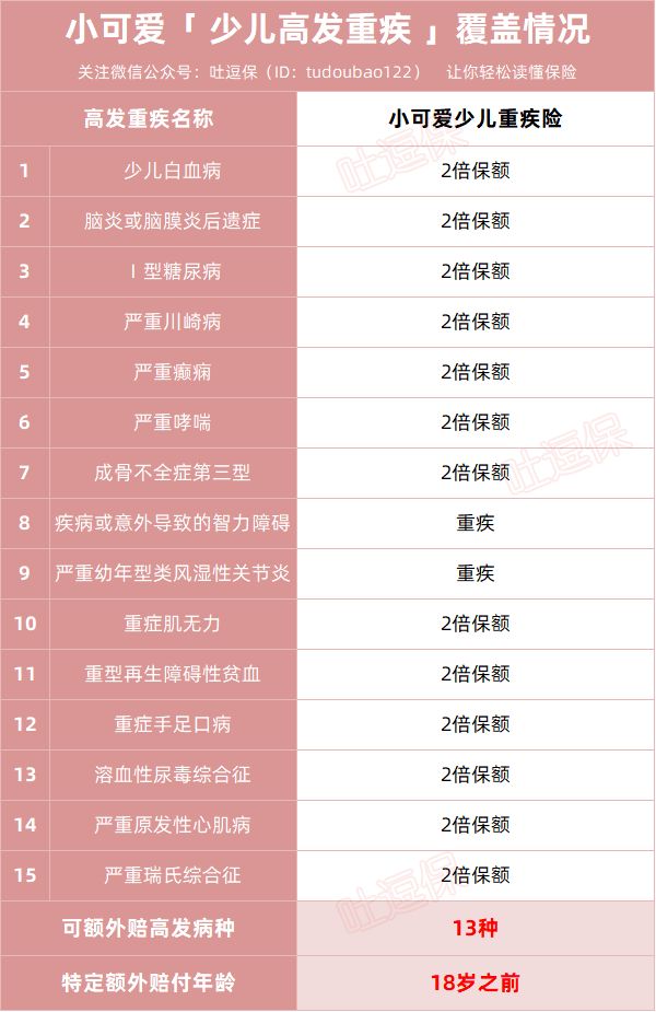作为一款优质的少儿重疾险,少儿特定疾病额外赔是一定要有的,这也是少儿重疾和成人重疾的主要区别。