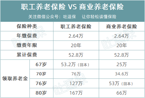 从表格中可以很直观的看出,职工养老险的领取是要高于商业养老险不少的,仅需要7年就可以回本!